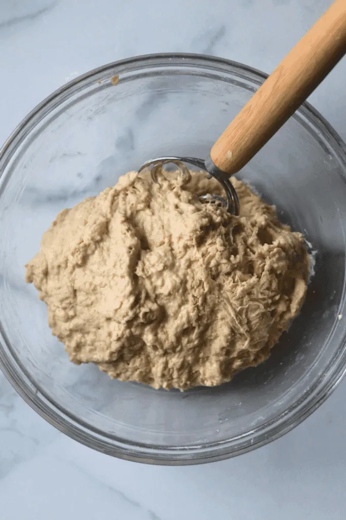 - To the wet ingredients, add the bread flour and salt. Be sure to mix until all of the flour is incorporated. The dough will look wet and sticky, not like a uniform dough ball.