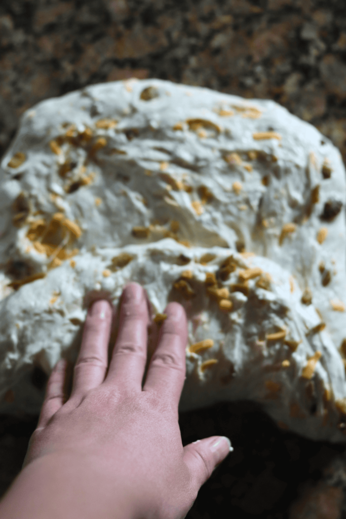 - To the top of your dough, sprinkle 1/3 of each mix-in. Perform one stretch and fold. Then add another 1/3 of the mix-ins, do one more stretch and fold. Add the last 1/3 of the mix-ins and complete the rest of the stretch and folds. Some inclusions may break through the dough, totally fine. They will continue to be mixed in during your next rounds of stretch and folds.
