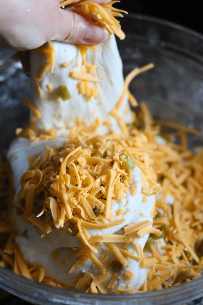 - Before starting your second set of stretches and folds, prepare the jalapeños and cheddar cheese.