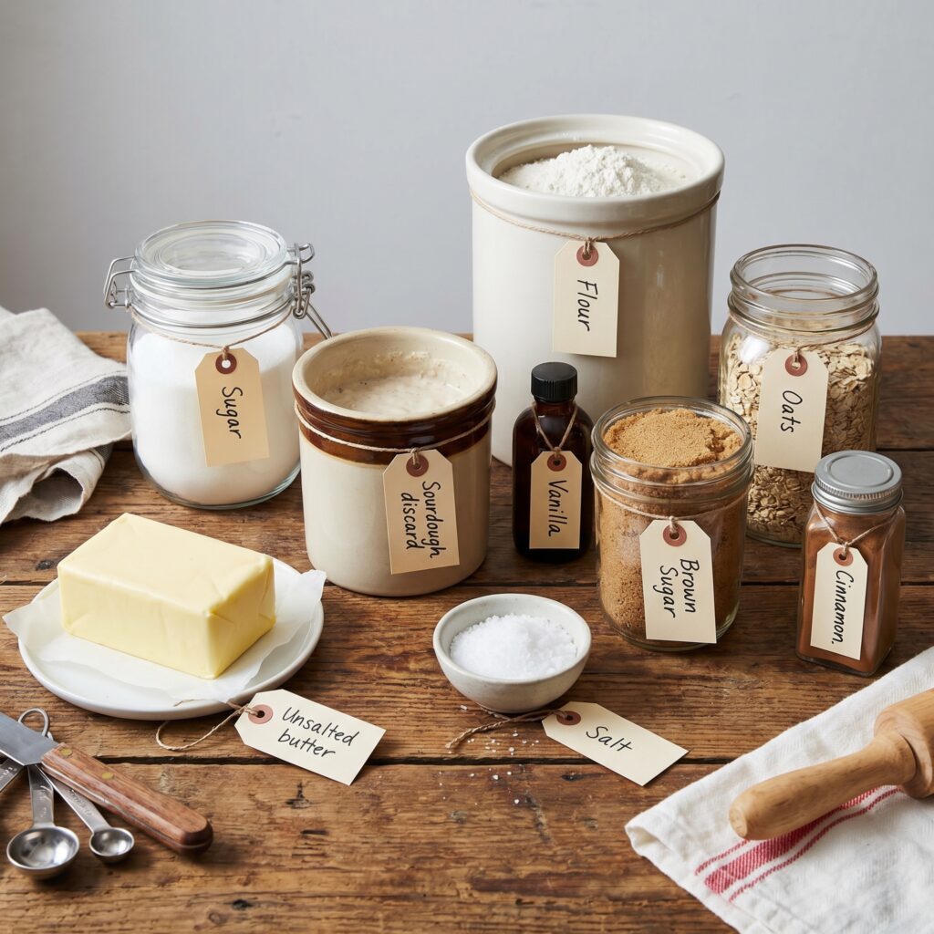 - 113g (1/2 c) unsalted butter, melted, 38g (3 T) sugar, 50g (1/4 c) discard, 4g (1 tsp) vanilla, 1g (1/4 tsp) salt
