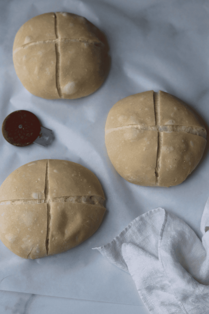 Lightly brush some water on the tops of the bread bowls. With a lame / razor blade or sharp knife, score the letter “X” on top of each dough ball. This is necessary for your bread to be able to expand while baking.