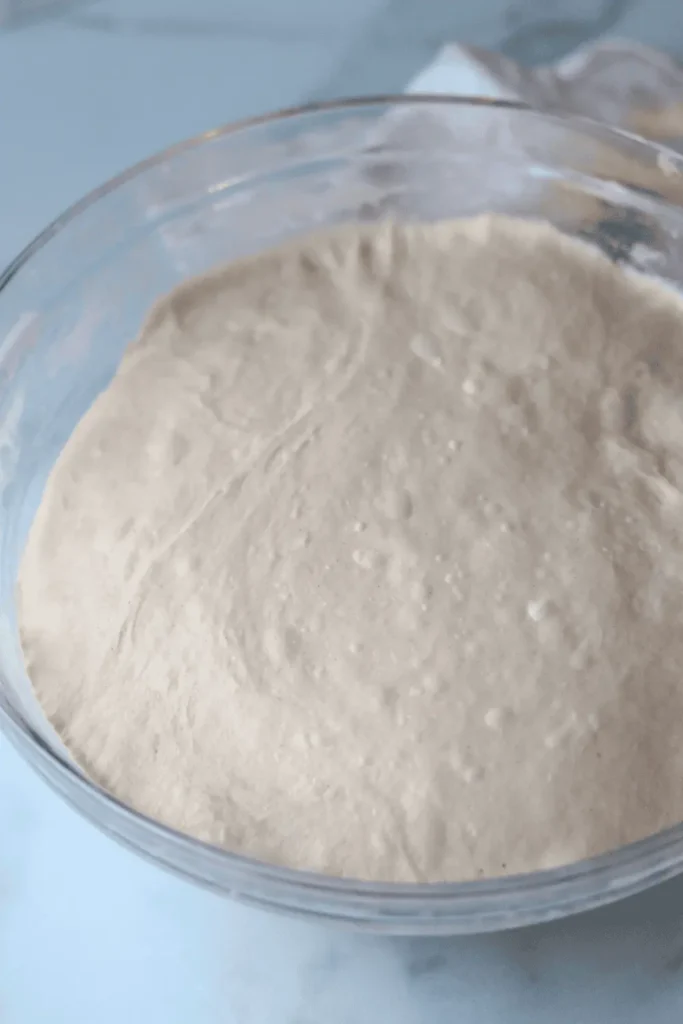 In a large mixing bowl, add the active sourdough starter and roo temperature filtered water. Mix with a Danish dough whisk or with your hand until it looks like a milky liquid.