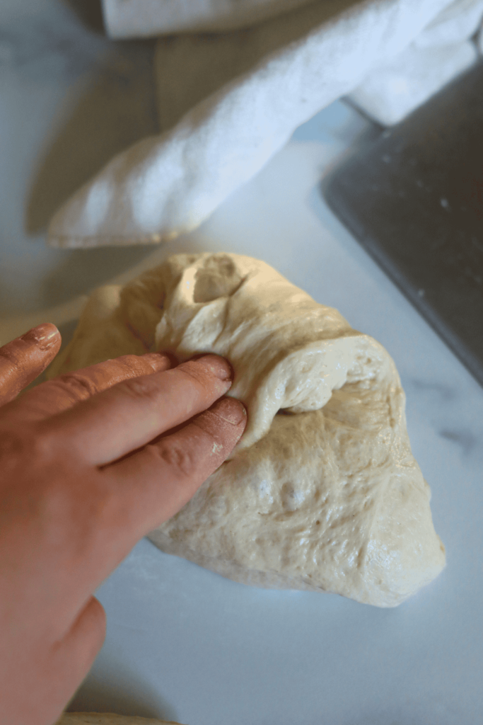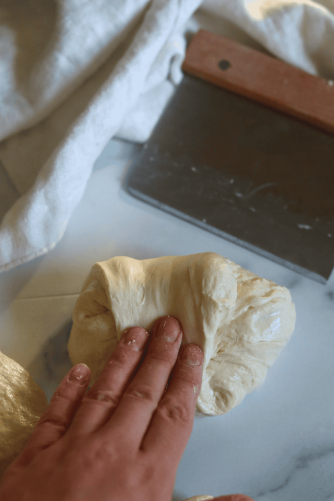 With a bench scraper or your hands, turn the dough upside down, so the seam is now on the counter. Cup your hands around the dough ball with both hands while rotating the dough counter clockwise to help create tension in the dough and a round shape.