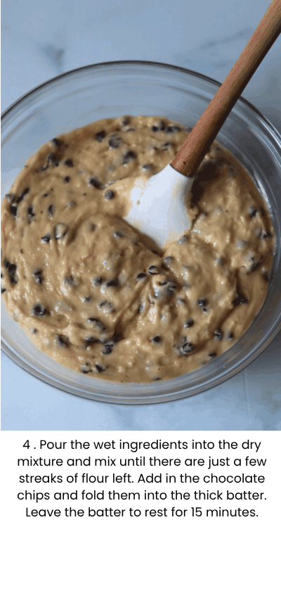 • Pour the wet ingredients into the dry mixture and mix until there are just a few streaks of flour left. With a rubber spatula, fold the chocolate chips into the thick muffin batter. Leave the batter to rest for 15 minutes.