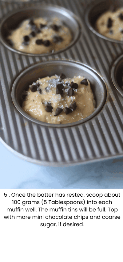 Morning (e.g., 10:05 AM)Fill Muffin TinScoop about 5 tablespoons (around 88-100 grams) of batter per cup. Optionally top with extra chocolate chips and coarse sugar.