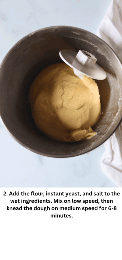 - Add bread flour, instant yeast, and salt. Mix on low speed until ingredients come together, then knead on medium speed for 6-8 minutes until dough is elastic and smooth.