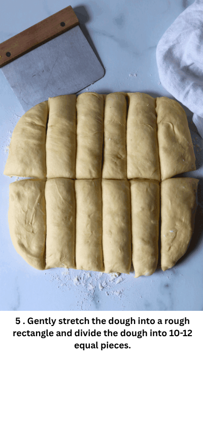 - Punch down the dough, stretch into a rectangle, and divide into 10-12 equal pieces.