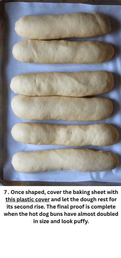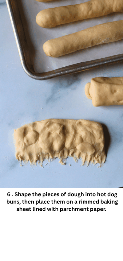 - Divide the dough into 10-12 equal pieces for buns. Shape each piece into a hot dog bun shape and place on a parchment-lined baking sheet, spaced slightly apart.