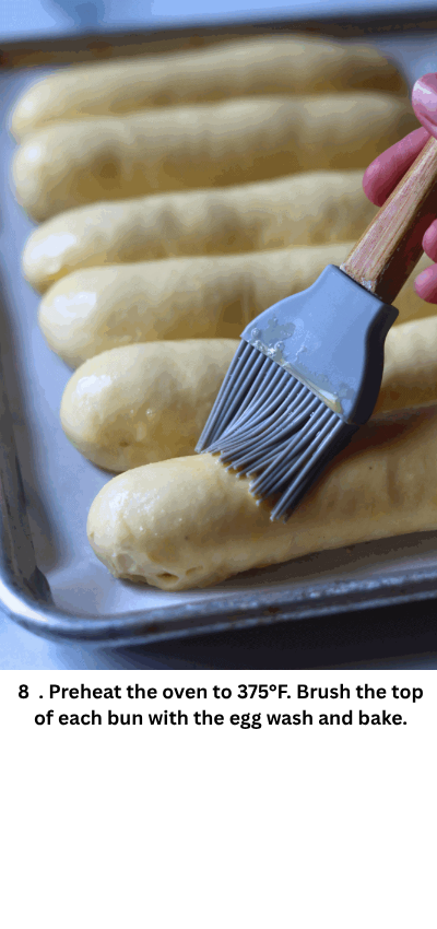 - Preheat oven to 375°F (190°C), brush buns with egg wash for shine.