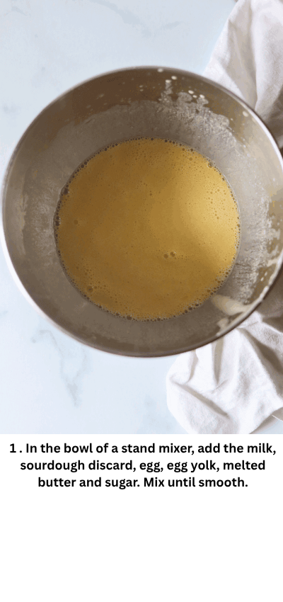 - In a stand mixer bowl, combine warm milk, sourdough discard, egg, egg yolk, melted butter, and sugar. Mix until smooth.