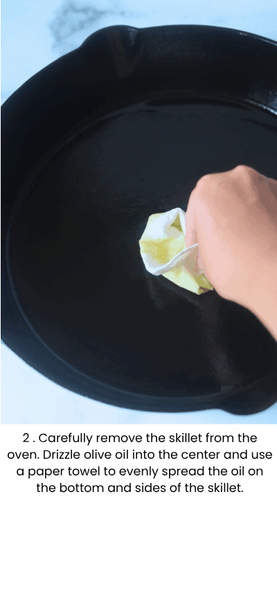 - Carefully remove the skillet from the oven and drizzle the olive oil in the center. Use a paper towel to evenly spread the oil on the bottom and sides of the skillet.