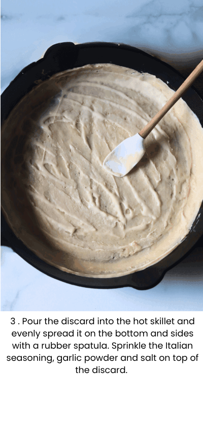 - Pour the discard into the hot skillet and evenly spread on the bottom and sides of the cast iron skillet with a rubber spatula. Sprinkle the Italian seasoning, garlic powder and salt on top of the discard.