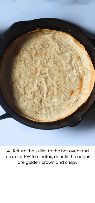 - Place the skillet back into the hot oven and bake for 10-15 minutes or until the edges are gold brown and crispy. The pizza crust should easily pop out of the skillet.