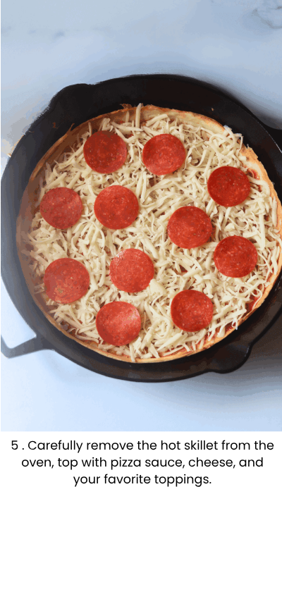 - Carefully remove the hot skillet from the oven, top with pizza sauce, cheese and favorite toppings. See notes for recommendations and quantities.