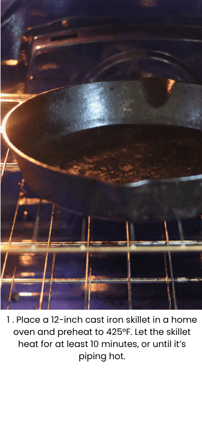 - Place a 12-inch cast iron skillet in an off oven and preheat to 425 degrees F. Preheat for at least 10 minutes or until piping hot.