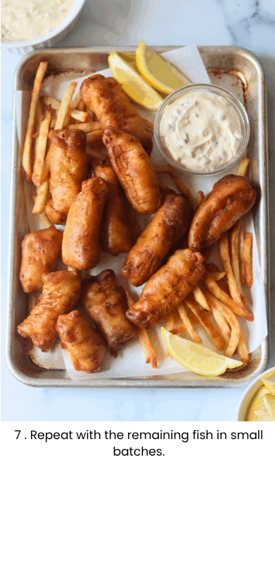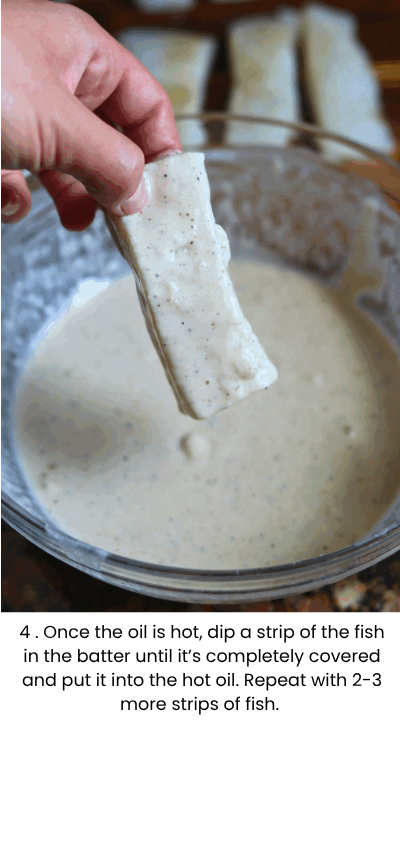 - Once the oil is preheated, dip a strip of the fish in the batter until it is completely covered and quickly place it into the hot oil. Repeat with 2-3 more strips of fish. You don’t want to overcrowd the pot with fish, otherwise the oil temperature will drop and the fish won’t fry properly. This will make the fish taste soggy, rather than crispy.