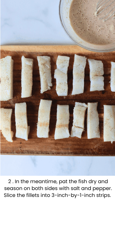 - In the meantime, pat the fish dry with a paper towel and season with salt and pepper on both sides. Slice the fillets into 3-inch by 1 inch strips and set to the side.