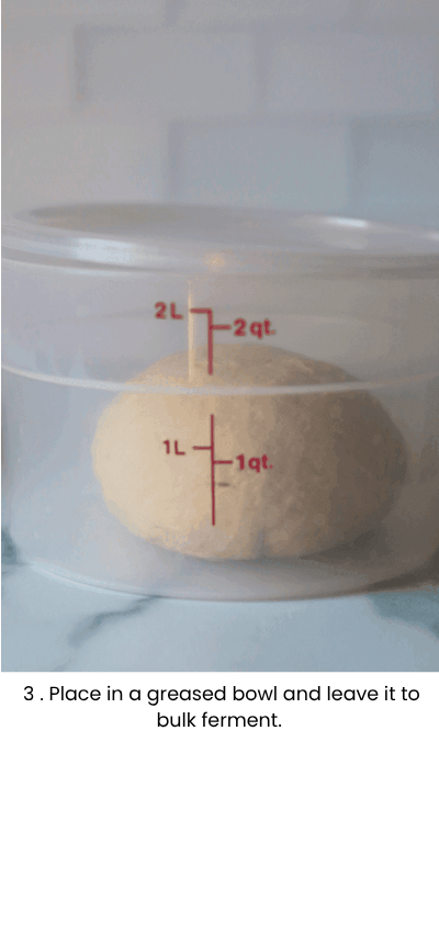 - Place the dough ball in a greased bowl, cover and leave it to bulk ferment. In my 70 degree F kitchen this took about 6 hours. If your kitchen is warmer, it will take less time, if your kitchen is cooler, it will take longer.