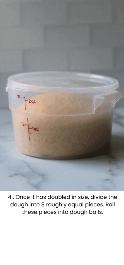 - Once the dough has doubled in size, divide the dough into 8 even pieces (about 82 grams each) and roll each piece into dough balls. Cover with a clean dish towel and leave the dough balls to rest for at least 30 minutes. This helps the gluten to relax, making it easier to roll out later.