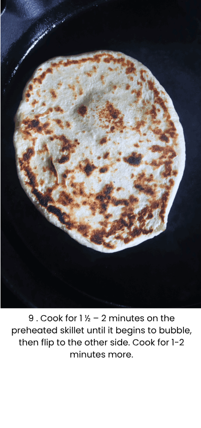 - Lightly grease the hot pan with oil, then cook one naan for 1 ½ – 2 minutes. It will begin to bubble, then flip. Continue to cook for 1-2 minutes more or until each side is covered with golden brown spots.