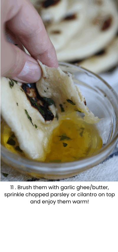 - Brush the hot sourdough naan with garlic ghee/butter, sprinkle chopped parsley or cilantro on top and enjoy them warm!